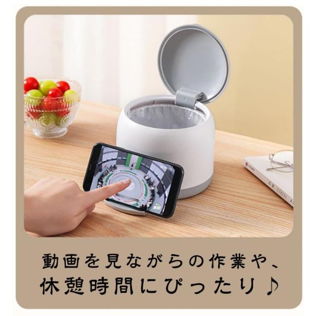 | スタンドを起こせばスマートフォンを立てることが出来る卓上ゴミ箱! 動画を見ながらの作業や、休憩時間にぴったり♪ 軽量なABC製でコンパクトなのでお部屋、リビング、キッチンなど日常の様々なシーンでお使いいただけます。 中のゴミ袋が見えない構造となっているスマート卓上ゴミ箱。 ふた付きのため大嫌いな匂い漏れも効果的に防ぎます。 クリアなボディとシンプルなカラーで一見ゴミ箱に見えないスタイリッシュンデザイン。 お部屋に置いてもインテリアの邪魔になりません。 | |