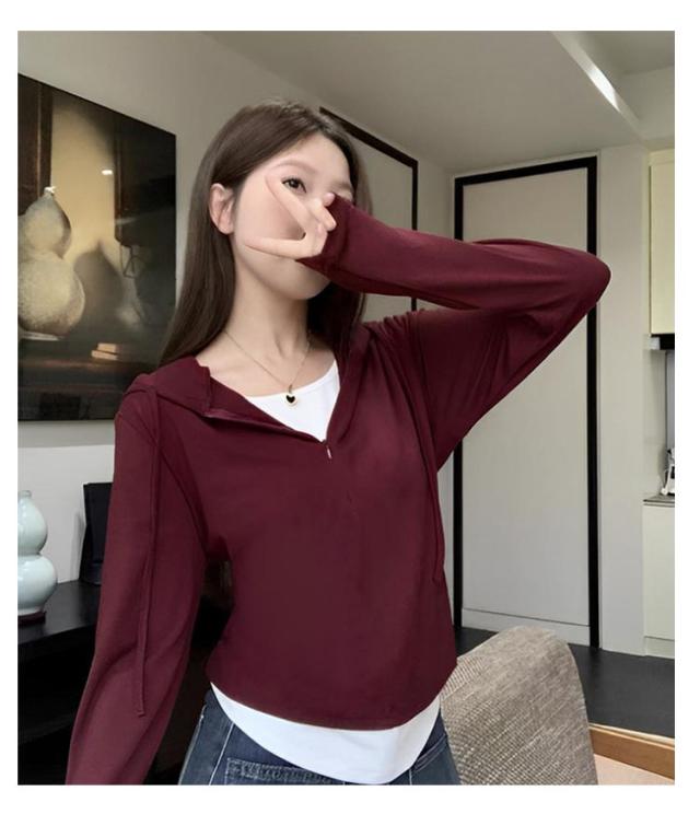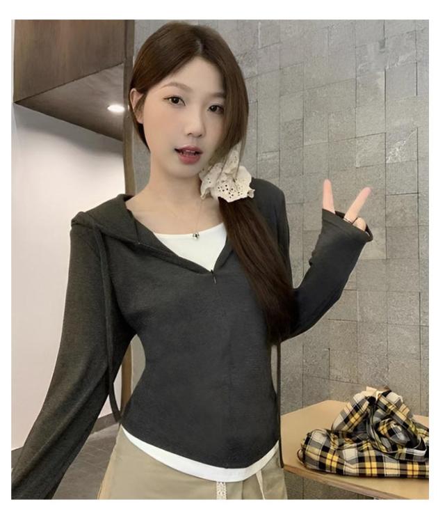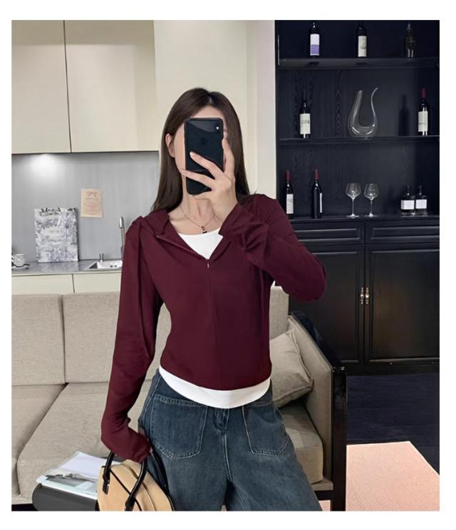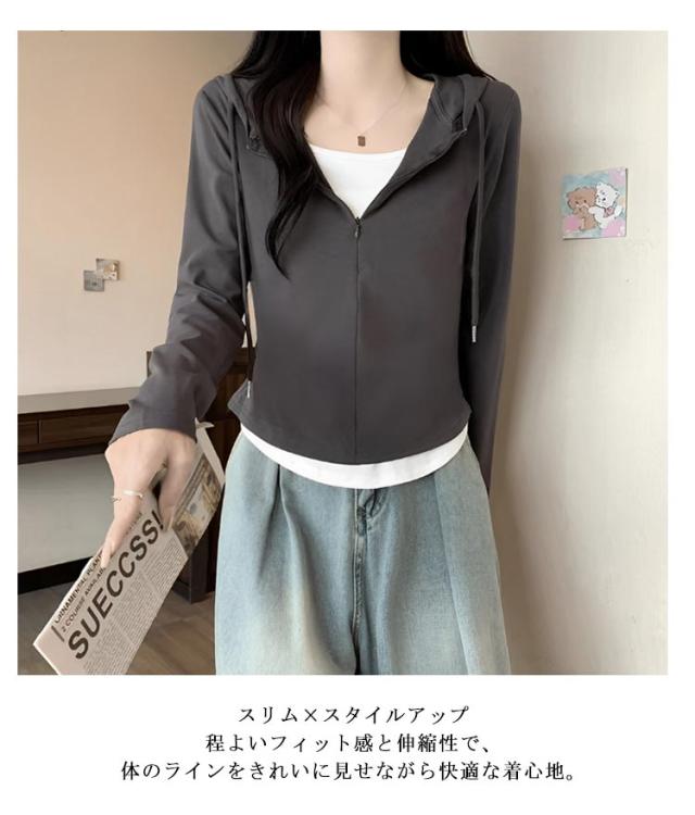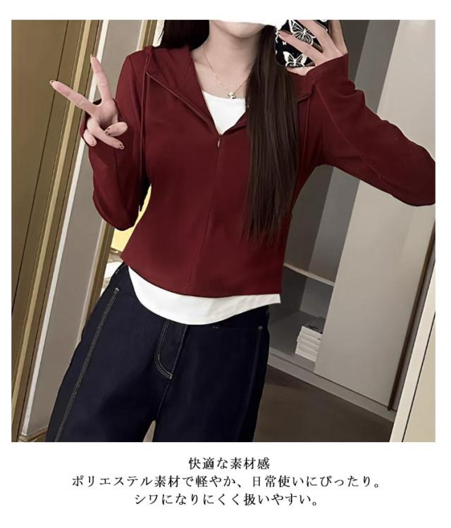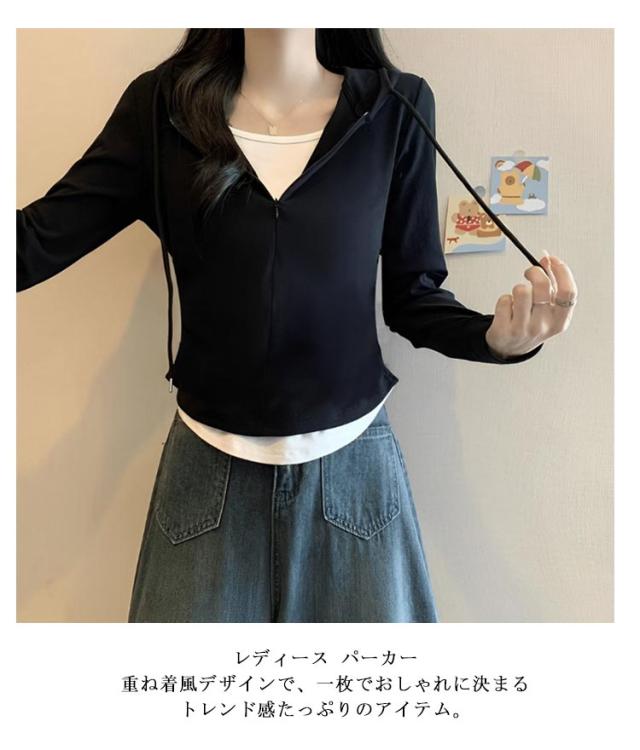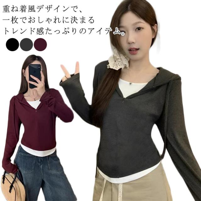 トップス パーカー フード付き レディース フィット感 フェイクレイヤード 重ね着風 プルオーバー スリム パーカー 長袖 韓国風 無地 シンプル おしゃれ パーカー 大きいサイズ 春