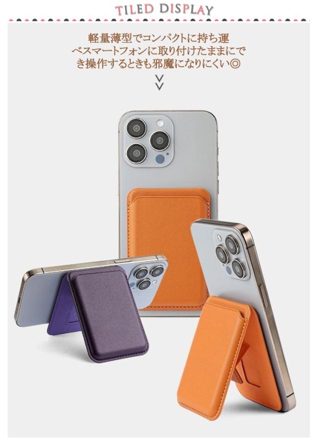 | マグネット式スマホスタンドが登場! 軽量薄型でコンパクトに持ち運べスマートフォンに取り付けたままにでき操作するときも邪魔になりにくい◎ 高級感のあるフェイクレザーを使用することで上品な仕上がりに。 一枚のカード収納可能。 1つ持ってるだけで便利なアイテムです。 | |