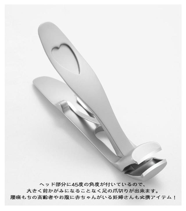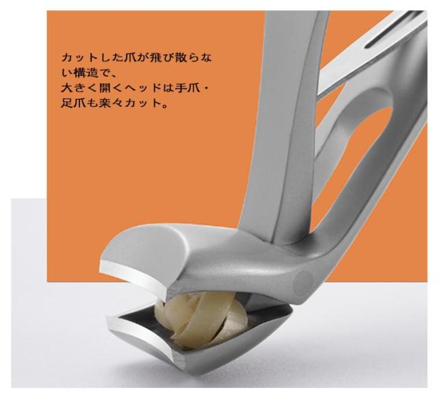 | 足用爪切り・爪やすり 45度の角度で楽々 収納ケース付き 「45度の角度」が爪切りを劇的に楽にする足用爪切り 誰にでも簡単キレイにカット出来る爪切りニッパーです。 ヘッド部分に45度の角度が付いているので、大きく前かがみになることなく足の爪切りが出来ます。腰痛もちの高齢者やお腹に赤ちゃんがいる妊婦さんも必携アイテム! 爪切りの素材はステンレスのため、サビにも強く衛生的にご使用いただけます。 爪やすりは頑丈な合金製。繊細なやすり目で、爪に優しい。 0.01mmの刃先で切れ味抜群なので、分厚い頑固な爪もスムーズにカット。巻き爪、厚い爪の様な面倒な爪のメンテナンスにも時間を掛けさせません。 カットした爪が飛び散らない構造で、大きく開くヘッドは手爪・足爪も楽々カット。 鉄製の収納ケース付きで持ち運び楽々。水洗いも出来て衛生的な爪切りです! | |