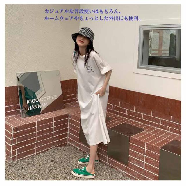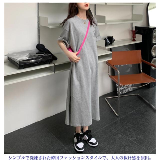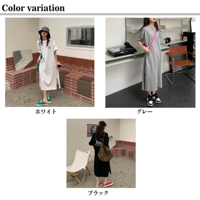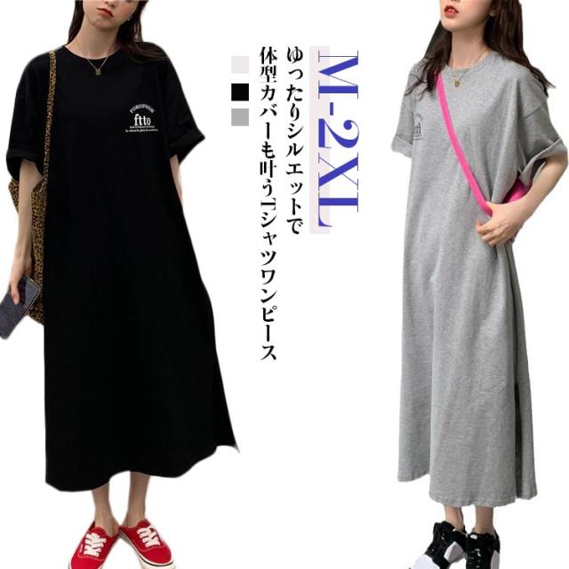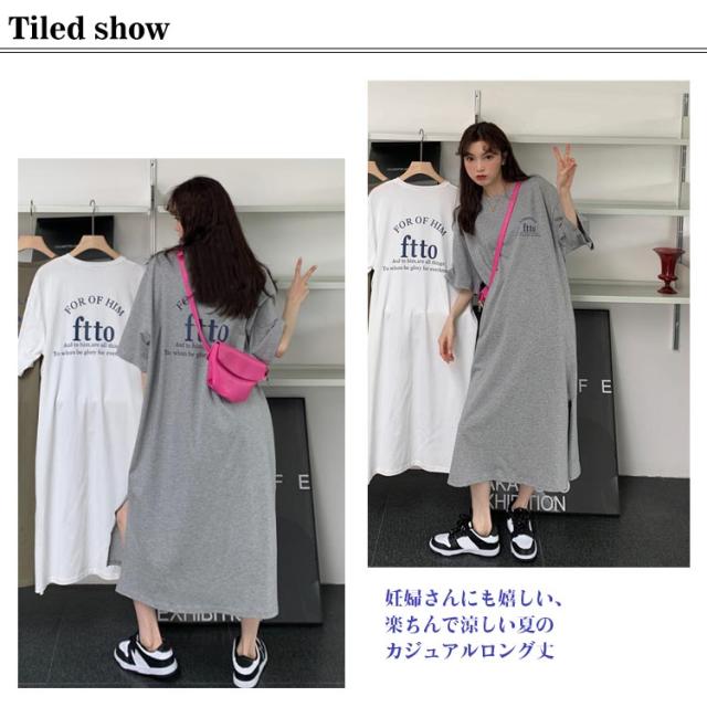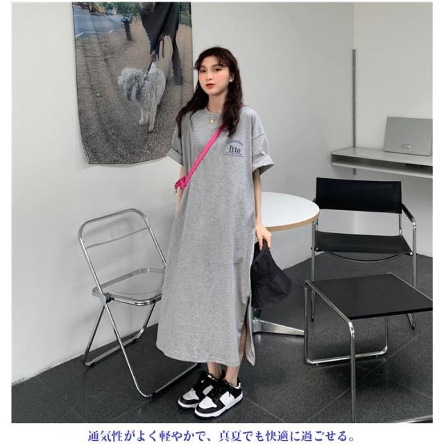 ロングワンピース 部屋着 レディース プリント Tシャツワンピース 大きいサイズ 春夏 ゆったり 体型カバー ロング丈 Tシャツワンピース リラックス シンプル スリット入り 無地 丸首 マタニティ ブラック ホワイト グレー 楽ちん
