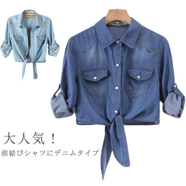 トップス シャツ レディース 長袖シャツ 大人 シャツ 長袖 デニムシャツ 前縛り ブラウス ショート丈 ロールアップ 半袖 カジュアル 前結びシャツ かわいい 薄手 韓国ファッション おしゃれ 春服 秋服
