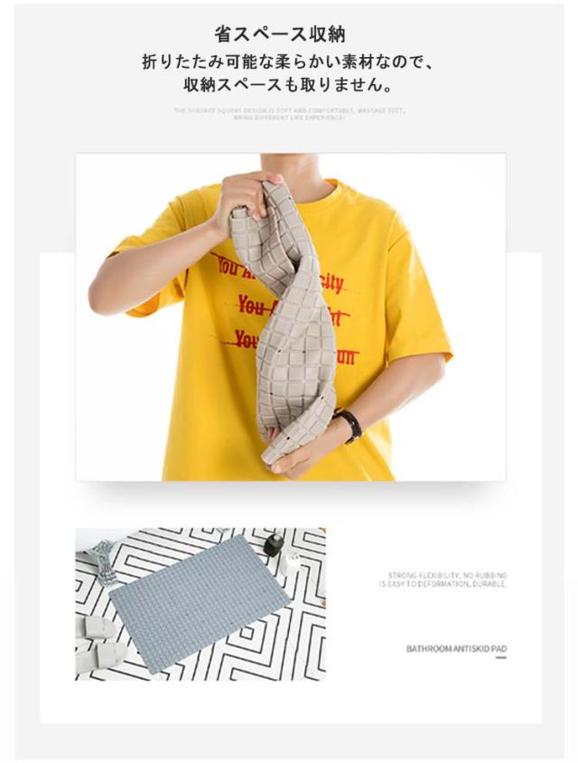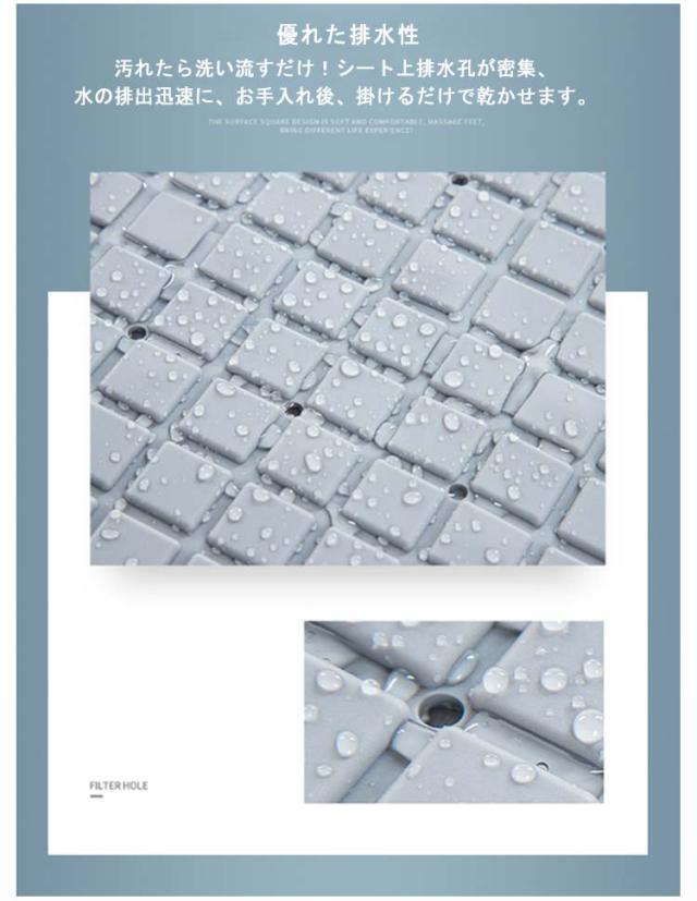 | 浴室や浴槽での転倒防止に役立つ滑り止めマットです。 【優れた排水性】汚れたら洗い流すだけ!シート上排水孔が密集、水の排出迅速に、お手入れ後、掛けるだけで乾かせます。 【吸盤付き】裏面に吸盤で床としっかり吸着、ズルズル動いたりしません。表面が滑り防止のための凸凹加工が施してあり、乗っても滑りにくくなっています。 【お手入れが簡単】表面には不純物がなく、使用後はきれいな水で洗い流すだけで、壁に簡単に吸収されるため、掃除が非常に便利です。 【省スペース収納】折りたたみ可能な柔らかい素材なので、収納スペースも取りません。 【適用シーン】浴室だけでなく、キッチン、洗面台、玄関、風呂洗い場マット、スパ、ホテル、ジムやベランダの出入り口などの滑りやすい場合適用されます。 | |