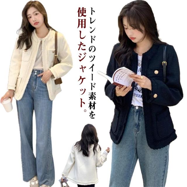 コート ジャケット レディース ノーカラージャケット ツイード ツイードジャケット 通勤 アウター フォーマル オフィス お洒落 大きいサイズ 体型カバー 長袖 ライトアウター ツイードブレザー 可愛い フェミニン シンプル 無地 春 秋