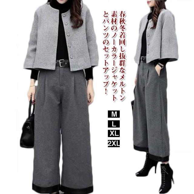 入園式 結婚式 パンツスーツ ギフト レディース セレモニー おしゃれ コート カジュアル 卒園式 スーツ きれいめ ノーカラージャケット 秋 フォーマル 春 セットアップ 入学式 卒業式 上品 母 ママスーツ 40代 50代 メルトン スーツ 大きいサイズ 体型カバー ワイドパンツ