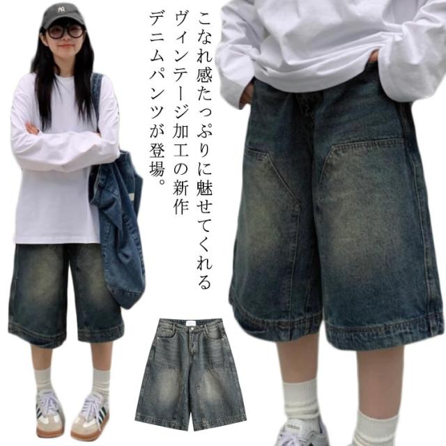 レディース ゆったり デニム ウォッシュ加工 ガウチョ 7分丈 ワイドパンツ 大きいサイズ クロップド 体型カバー 40代 デニムパンツ コットン 春 夏 秋 大人カジュアル 30代 ジーパン