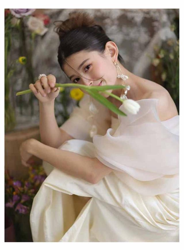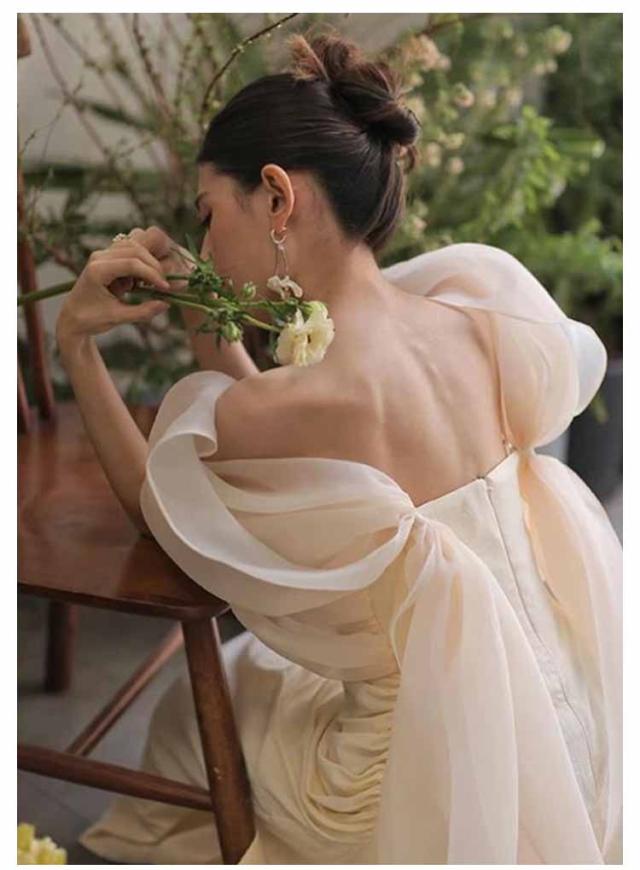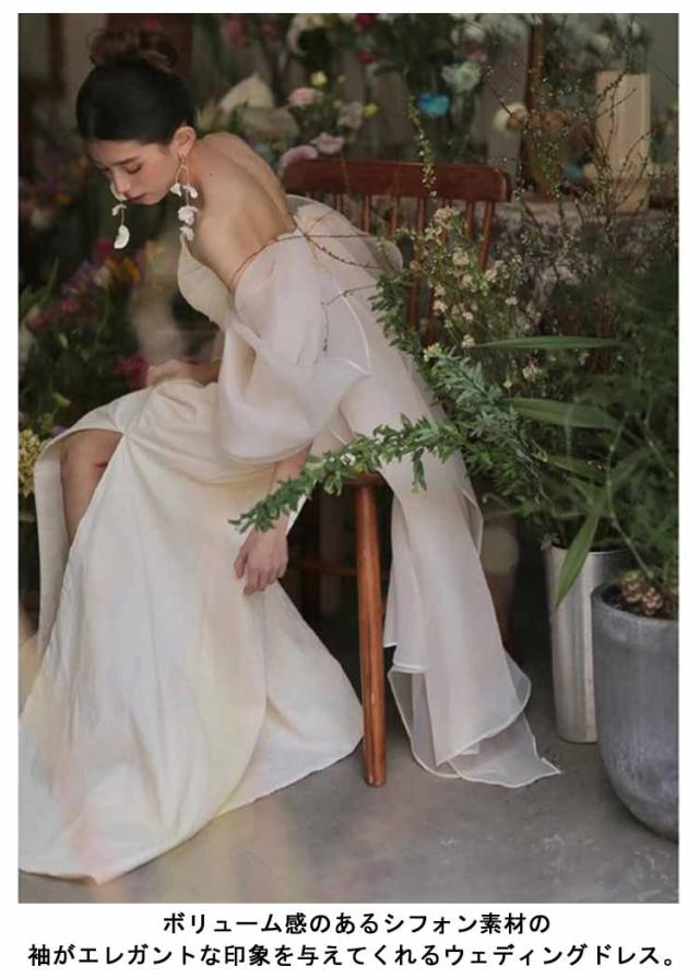 | ウェディングドレス マーメイド オフショルダー 袖シフォン ボリューム感のあるシフォン素材の袖がエレガントな印象を与えてくれるウェディングドレス。 オフショルダーは、デコルテラインを美しく見せてくれます。 | |