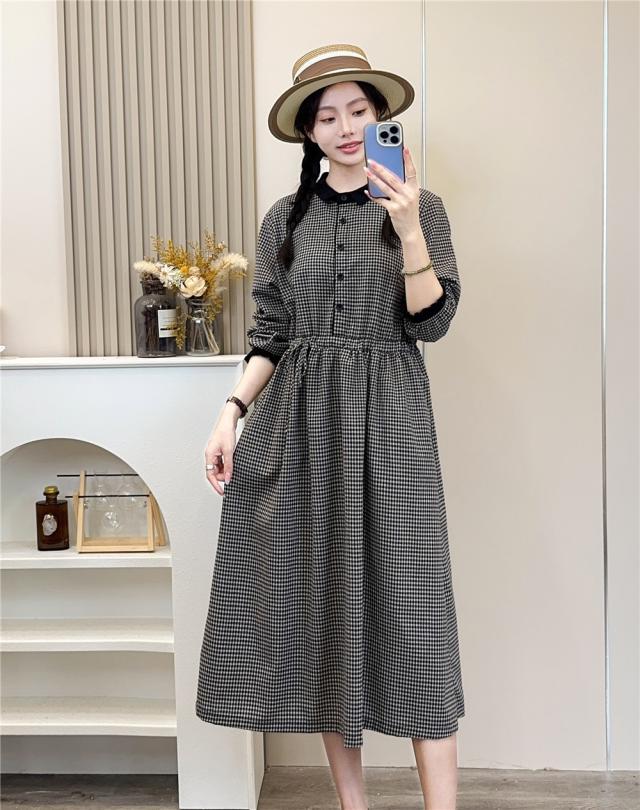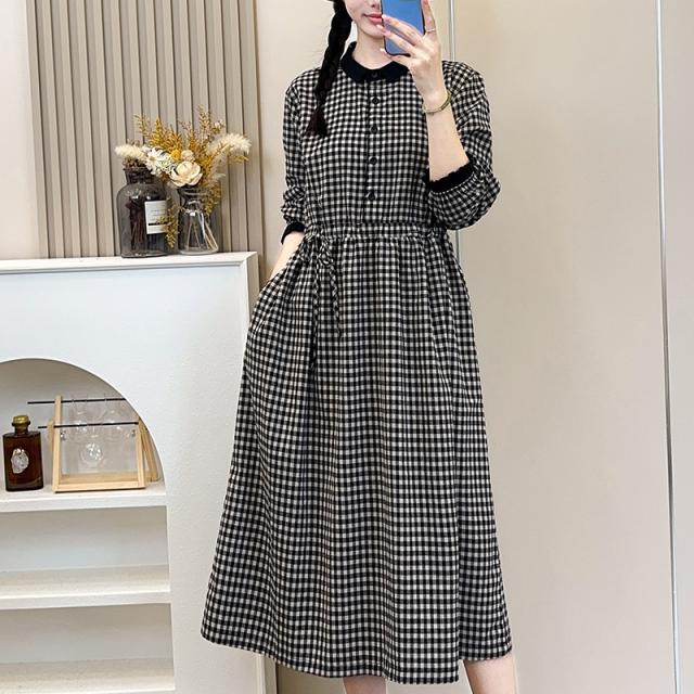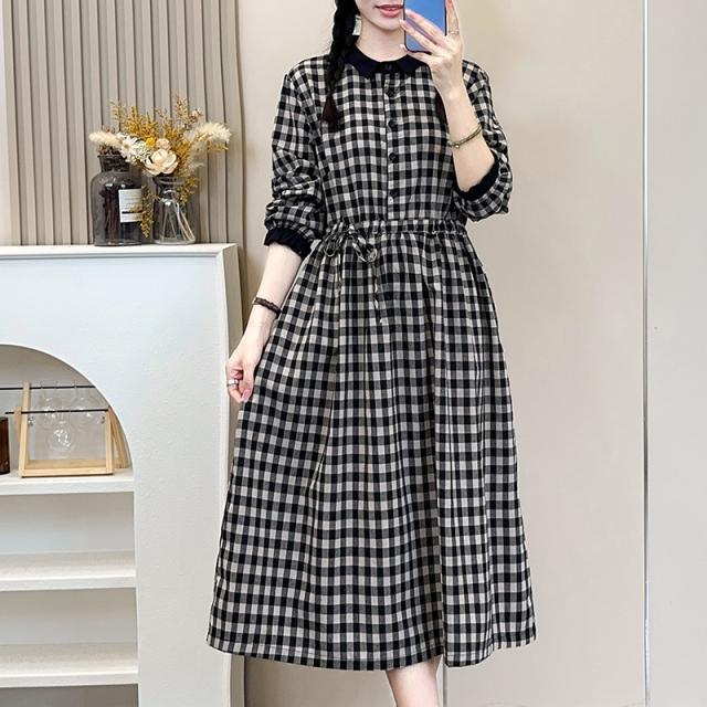 チェック ワンピース レディース ミディ丈 膝下 襟付き 長袖 ロング フォーマル ひざ下 ひざ丈 膝丈 Aライン きれいめ 秋 冬 春