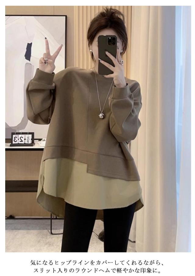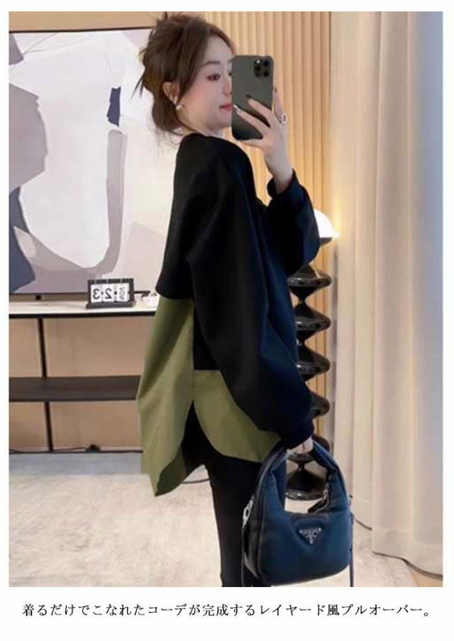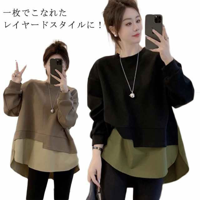 トップス ドッキング プルオーバー 長袖 ブラウス アシンメトリー 冬 重ね着風 ビッグシルエット チュニック 大きいサイズ レイヤード 体型カバー 着痩せ 秋服 秋物 春 秋 チュニック スウェットトレーナー ロンT 送料無料