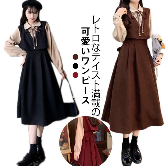 大きいサイズ 長袖 ワンピース 冬 通勤 ロング丈 秋 体型カバー 森ガール 膝下丈 ワンピース 着痩せ 重ね着風 女子高校生 フェイクレイヤード レディース ロングワンピース 通学 可愛い 女子 レディース かわいい 着?せ ブラック レッド クリスマス ギフト プレゼント
