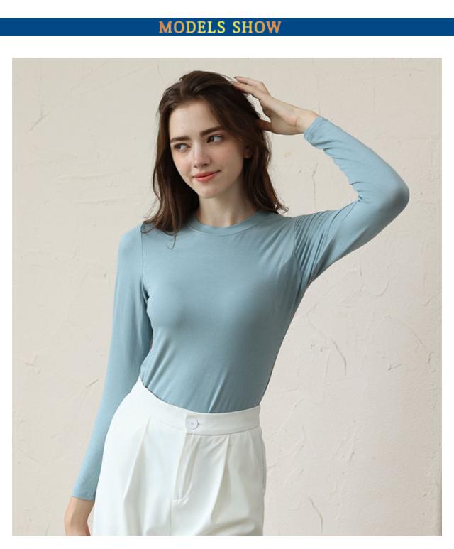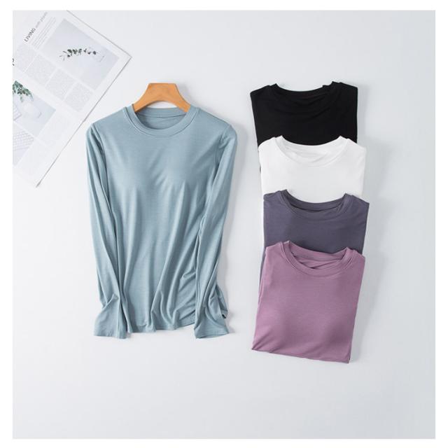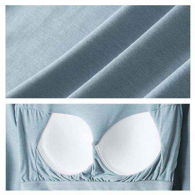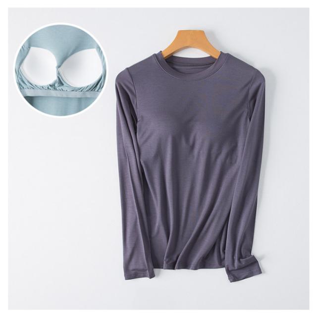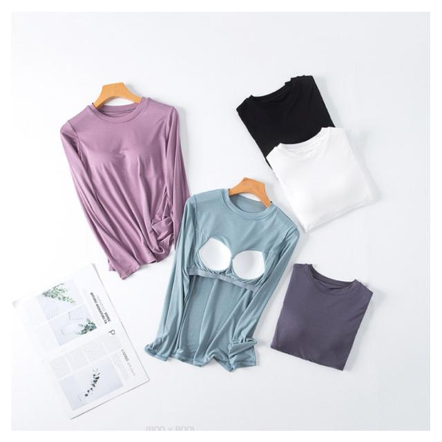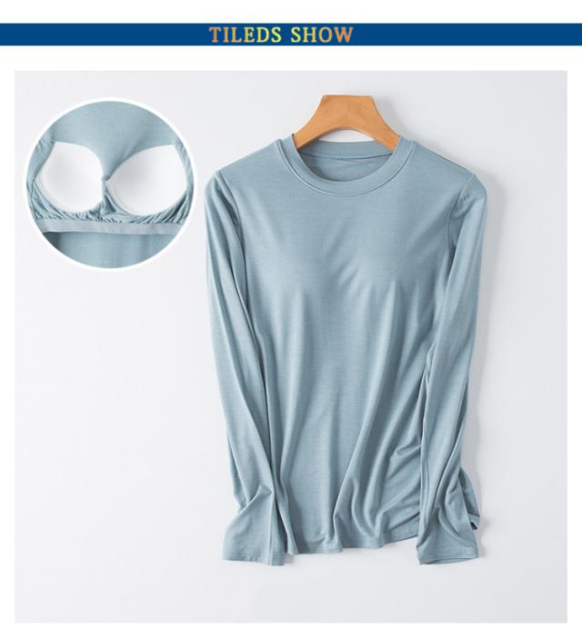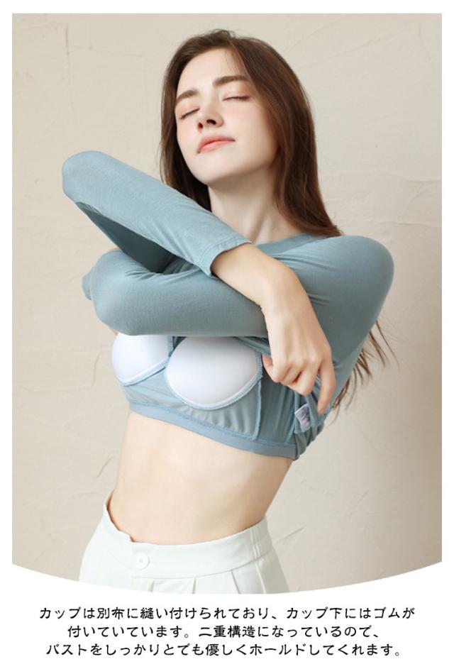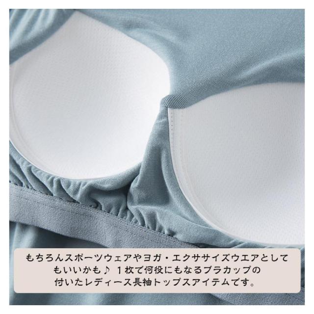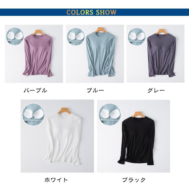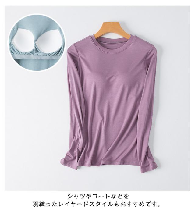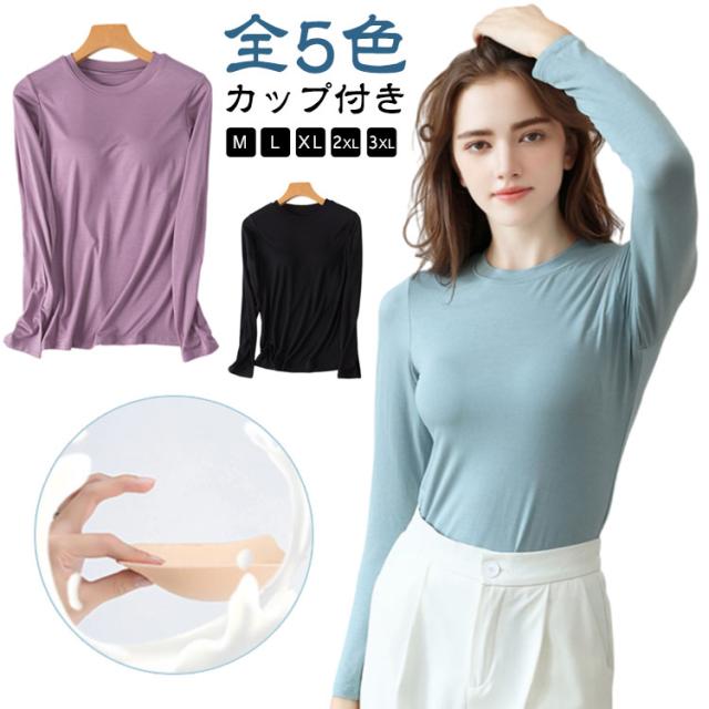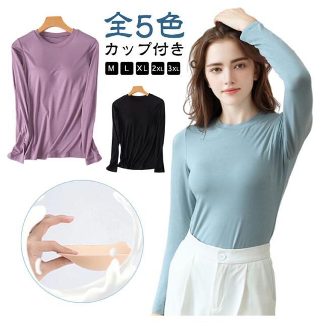 M-3XL カットソー Tシャツ レディース インナー 無地 ブラトップ 秋冬 カップ付き 秋 カップ付き 肌着 カップ付きインナー 長袖 全5色 冬 クルーネック トップス 丸首 ルームウェア ストレッチ パジャマ 部屋着