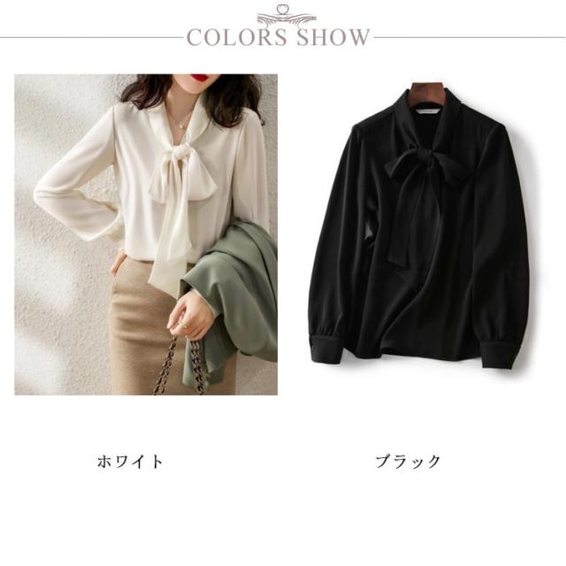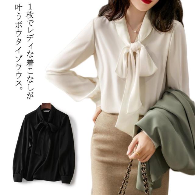 長袖 ボウタイ 春 フェミニン Vネック シフォン 秋 フォーマル リボン トップス 冬 白 ブラウス きれいめ オフィスカジュアル ホワイト レディース 上品 黒 ブラック きれいめ 上品 大人 20代 30代 無地