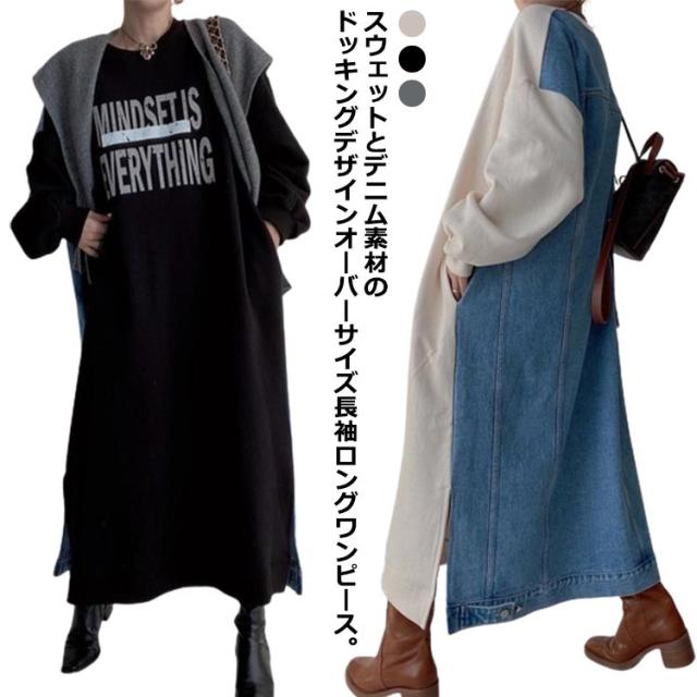 マキシ丈 スウェットワンピース ロングトレーナー デニム レディース 送料無料 デニムワンピース 春 スウェット 長袖ワンピース ドロップショルダー クルーネック 春 秋 オーバーサイズ マキシワンピース ゆったり 体型カバー カジュアル トレーナー 長袖