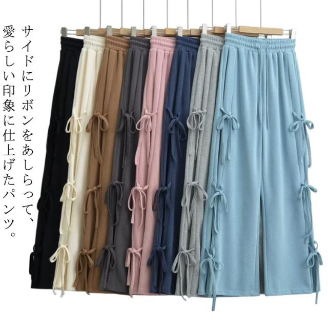 ルーズ スウェットパンツ パンツ リボンポイント 秋 サイドリボン ウエストゴム ワイド ロング丈 リボン ワイドパンツ ゆったり カジュアル お出かけ 楽ちん 送料無料 部屋着 ルームウェア レディース 春 ボトムス