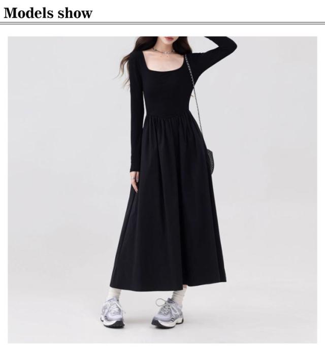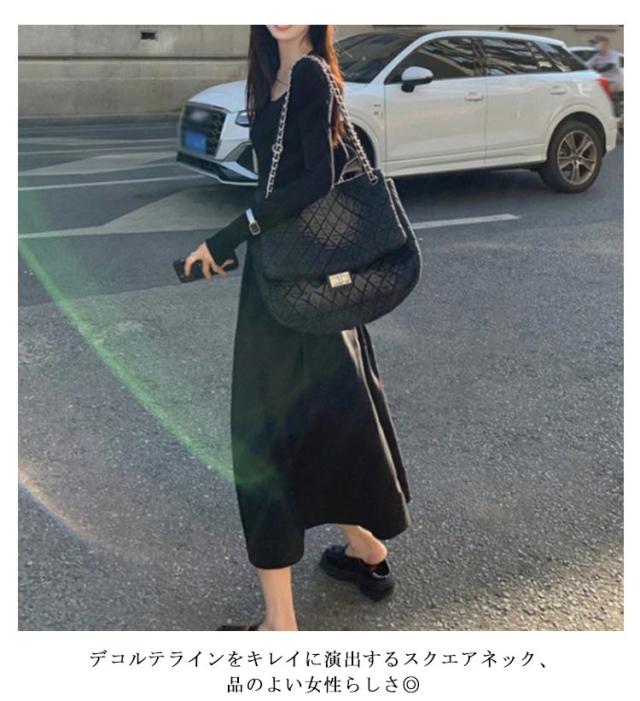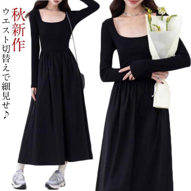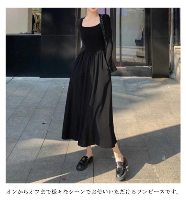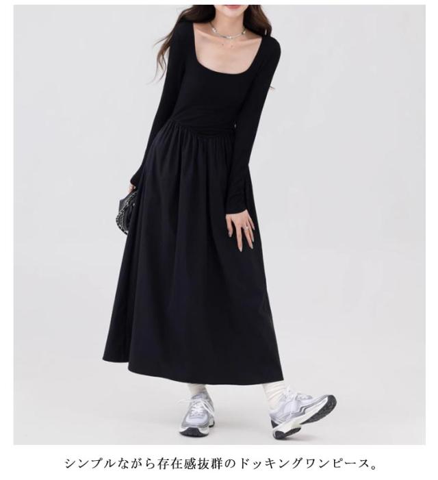 スクエアネック ドッキングワンピース 長袖 切り替え 春 ドッキング ひざ下 異素材 秋冬 タイト ワンピース ミモレ丈 ロングワンピース 秋新作 ワンピースドレス イベント 通勤 セクシー ハイウエスト スリム 細身 お出かけ お呼ばれ ワンピース
