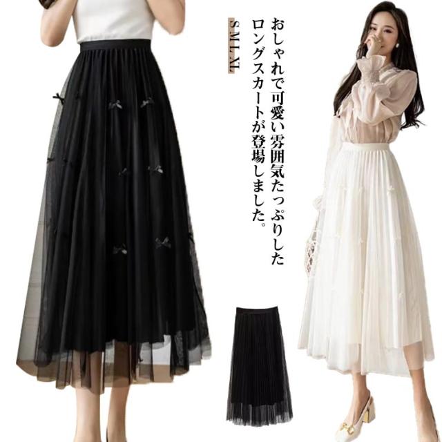 ハイウエスト 春 レディース ロングスカート フレアスカート チュール フレア リボン チュールスカート レース チュール ふんわり ボトムス ウエストゴム 夏 スカート 秋 マキシ丈 ミモレスカート キレイめ スカート ボリューム ファッション ゆったり