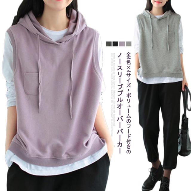 パーカー 秋 レイヤード風 体型カバー カジュアル レディース ノースリーブ トップス フード付き 綿 プルオーバーベスト ゆったり スウエット 春 冬 レイヤード風 重ね着 大きいサイズ 無地 シンプル おしゃれ 通勤 通学 ギフト ベスト