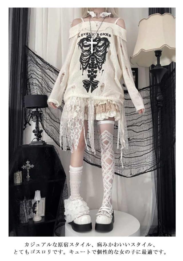 肩出し カットソー ダメージ加工 地雷系 長袖 セーター トップス 春 オフショルダー 肩ベルト 秋 量産型 オフショルダー レディース フェミニン おしゃれ 服 学生 着?せ パンク 原宿風 ゴスロリ 病みかわいい サブカル系 Y2K