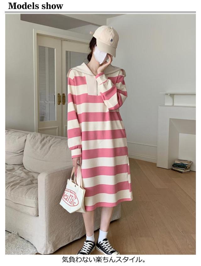 インナー 長袖 ロング丈 ふんわり ワンピ 綿混 長袖 ミモレ丈 膝下 セーラー ポッケト レディース セーラーネック 裏毛 無地 ボーダー ストライプ ゆったり 秋 冬 ルームウェア ワンピース