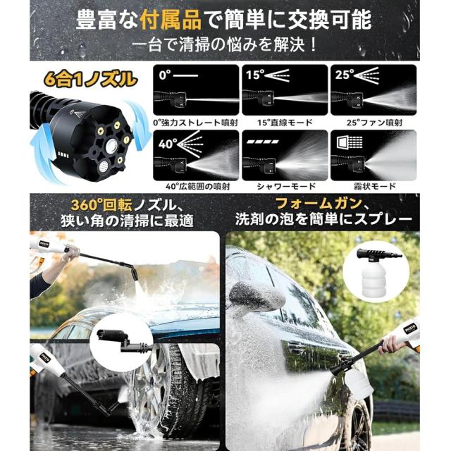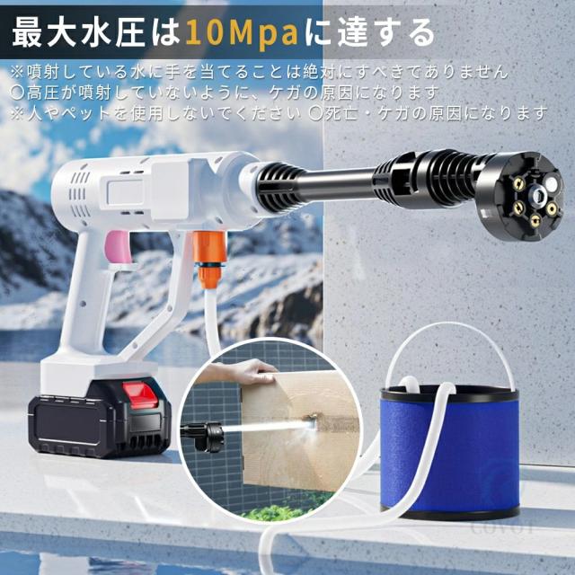 【10MPa】高圧洗浄機 コードレス 充電式 ポータブル 21Vバッテリー対応 吐出圧力10MPa 吐出水量:12L/min 強力噴射 6in1 静音 パワフル 大掃除 軽量 家庭用 収納ケース付 自吸式 家庭用 ベランダ 持ち運び便利 洗車 屋外 ベランダ