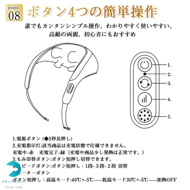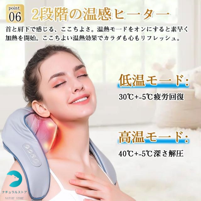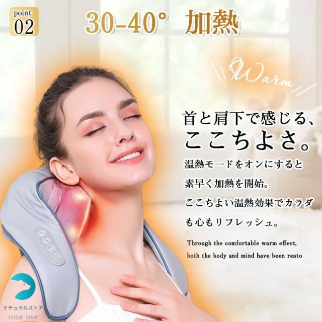 【ヒーター機能搭載】:もみ玉にヒーターが内蔵さており、約30-40℃に加熱し、あたたかなマッサージをを行ってくれます。リラックスと筋肉のコリをほぐすことに役立ちます。