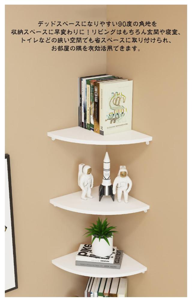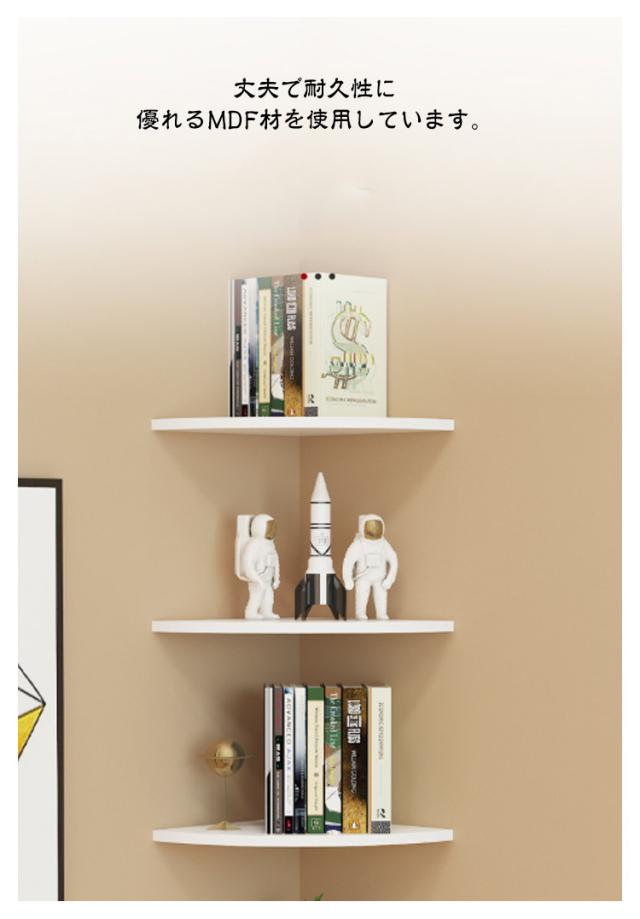 | 【3枚セット】 【コーナーシェルフ】 お部屋のコーナーを有効活用! 丈夫で耐久性に優れるMDF材を使用しています。 耐荷重も20kgとしっかりしており、様々な収納物に対応できます。 デッドスペースになりやすい90度の角地を収納スペースに早変わりに!リビングはもちろん玄関や寝室、トイレなどの狭い空間でも省スペースに取り付けられ、お部屋の隅を有効活用できます。 本、充電器、ルーター、コンセント、小物や観葉植物の置き場所としてもおすすめ。場所を取らずに、ちょこっと飾りたい時に便利です。 ピン取り付け構造で壁にしっかり固定!壁の穴は最小限なので、家賃のお部屋や新居にも選ばれています。 | |