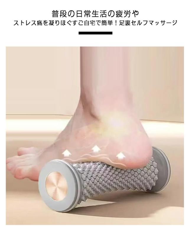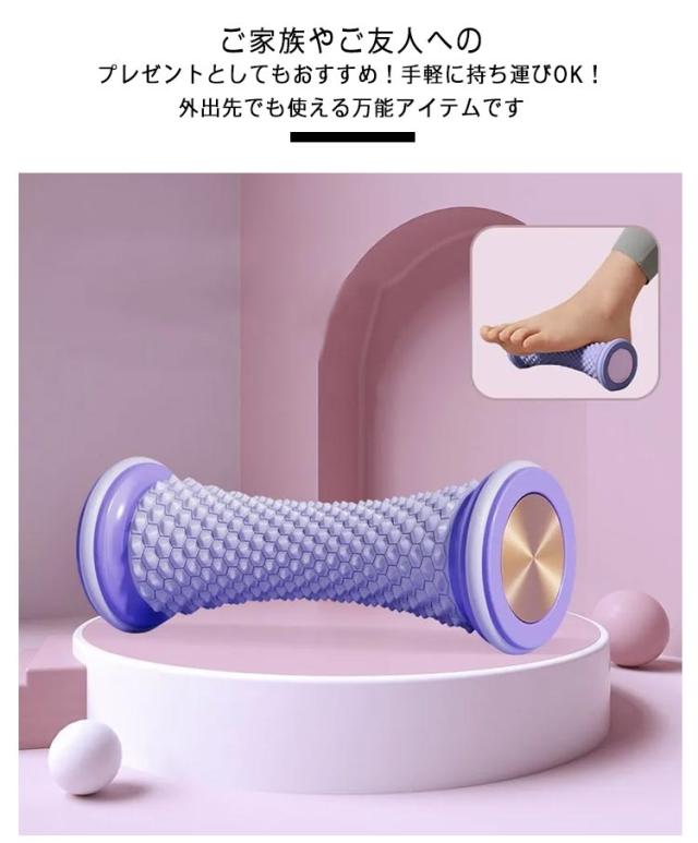 | 毎日の疲れをスッキリ解消!足つぼローラー! 普段の日常生活の疲労やストレス痛を凝りほぐす ご自宅で簡単!足裏セルフマッサージ ? 足のマッサージによりもみほぐしてあげることで血行をよくし、足先むくみや冷えなどを改善する効果もあります。 ? 一日の疲れをほぐし、全身リラックスさせることで自律神経、ホルモンバランスの乱れを予防し睡眠の質を向上させる効果につながります。 ? ご家族やご友人へのプレゼントとしてもおすすめ! 手軽に持ち運びOK!外出先でも使える万能アイテムです | |