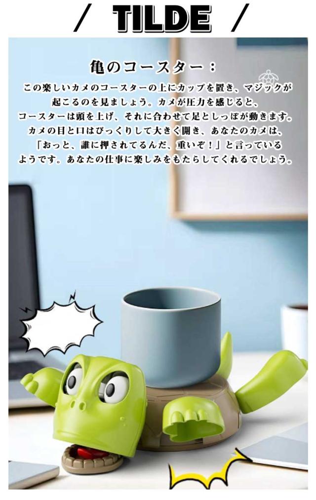 | 亀のコースター:この楽しいカメのコースターの上にカップを置き、マジックが起こるのを見ましょう。カメが圧力を感じると、コースターは頭を上げ、それに合わせて足としっぽが動きます。カメの目と口はびっくりして大きく開き、あなたのカメは、「おっと、誰に押されてるんだ、重いぞ!」と言っているようです。あなたの仕事に楽しみをもたらしてくれるでしょう。 ユニークなデザイン: 高度な3D印刷技術で作られており、変形や色あせがしにくく、耐久性に優れています。 幅広い用途: コーヒーマグカップ、ティーカップ、ビアマグなど、このコースター おしゃれ、リビングルームやオフィスなど、どこにでも置くことができます。 完璧な贈り物: この面白いカメのコースターは、お友達やご家族へのプレゼントに最適です。誕生日、クリスマス、お祝いなど、様々なシーンに最適です。 | |