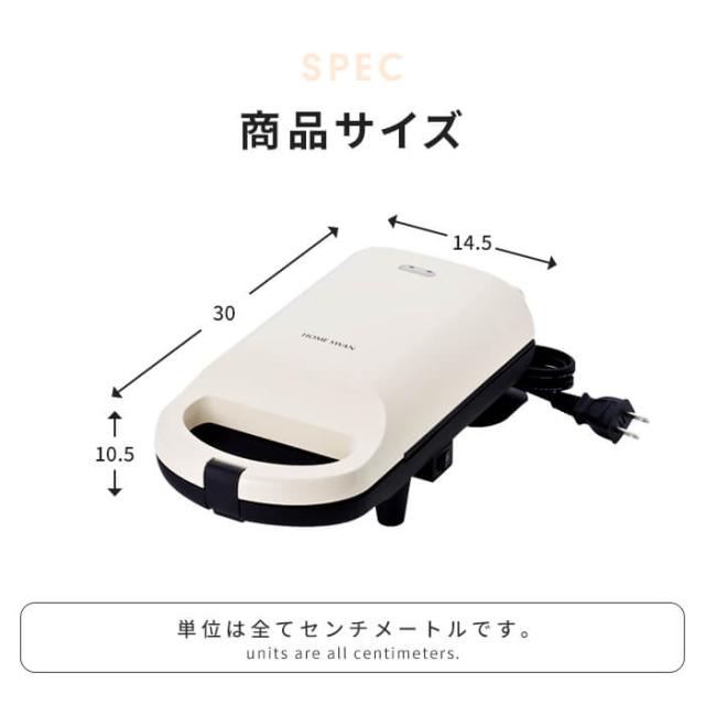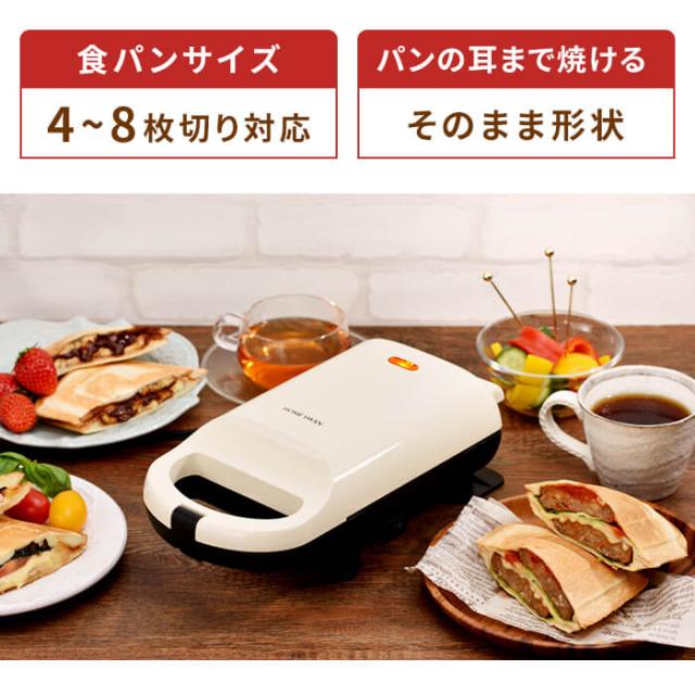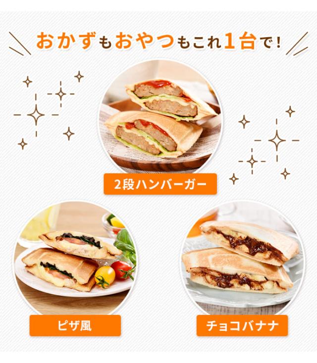 | ・あつあつをもりもりに作れるホットサンドメーカー。 ・8枚切り3枚使えるボリューム感。 ・4〜8枚切り食パン対応。 ・食パンの耳まで焼ける”そのまま形状”。 ・スイッチ付きで安心。 ・通電がわかるパイロットランプ付き。 ・プレート固定式 |