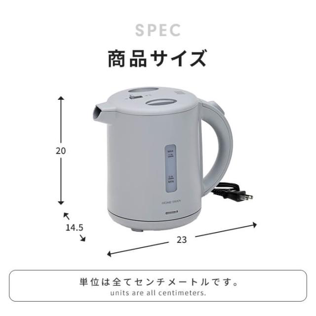 | 倒れてもお湯がこぼれにくい転倒防止付き電気ケトル。 沸騰目安時間は140mlで約80秒、1.0Lで約7分30秒。 お湯が沸くと自動で電源が切れます。 ワンタッチで給湯可能。 ふたは給水しやすい着脱式。 シンプルなデザインとシックなグレーカラー卓上になじみます。 |