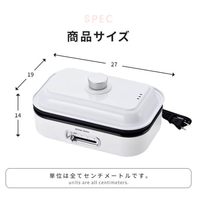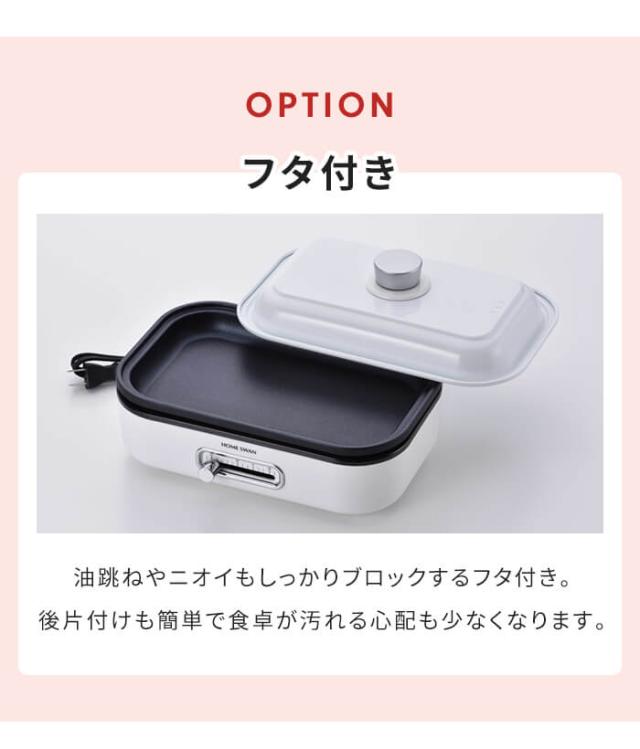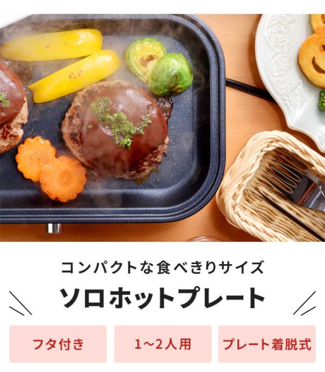 | ・1〜2人用にちょうどいい大きさのフタ付きホットプレート。 ・温度調節機能付きで調理から保温まで可能。 ・およそA4サイズでテーブルの場所を取らずに調理ができます。 ・フッ素樹脂塗装でお手入れ簡単。 ・プレートは着脱式で丸洗いできます。 |
