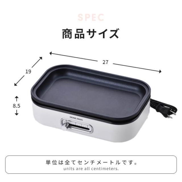 | ・1〜2人用にちょうどいい大きさのホットプレート。 ・たこ焼きプレート付き(φ40mm×13穴) ・温度調節機能付きで調理から保温まで可能。 ・およそA4サイズでテーブルの場所を取らずに調理ができます。 ・フッ素樹脂塗装でお手入れ簡単。 ・各プレートは着脱式で丸洗いできます。 |