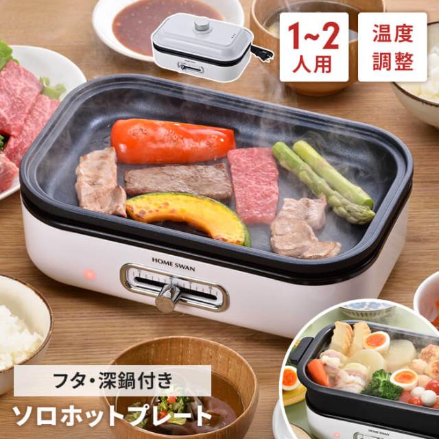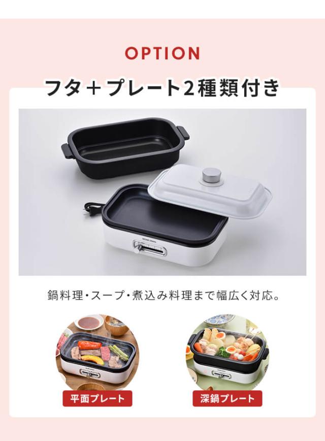 | 平プレートと深鍋が付属した1〜2人用にちょうどいい小さなホットプレート。 温度調節付きで調理から保温まで可能。 およそA4サイズで場所を取らずに調理できるので、調理しながら熱々を食べられます。 フッ素樹脂加工でお手入れ簡単。 平プレートも深鍋も着脱式で丸洗いOK。 |
