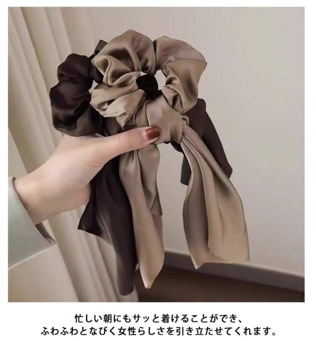 | ヘアスタイルを大人可愛く魅せるボリュームたっぷりのサテン調シュシュ。 揺れるリボンが大人っぽく華やかなアクセントになります。 サテン調の生地なので可愛くなりすぎず、華やか&上品な仕上がりに◎ ポニーテールにして巻き付けてもとってもお洒落です! 普段使いからオフィス、結婚式などのイベント時と幅広いシーンでお使いいただけます。 忙しい朝にもサッと着けることができ、ふわふわとなびく女性らしさを引き立たせてくれます。 | |