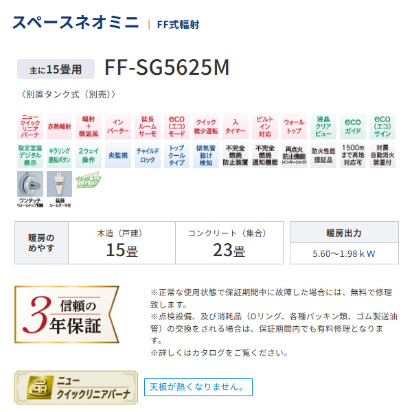 ※こちらの商品は別途工事が必要です。 取付けは取付工事専門業者にご依頼ください。 FF式輻射大型石油ストーブ FF-SG5625M-W 主に15畳用 別置タンク式(別売) ■暖房のめやす 温暖地 木造15畳(25.0m2)まで コンクリート20畳(33.0m2)まで 寒冷地 木造15畳(25.0m2)まで コンクリート23畳(38.0m2)まで ■暖房出力:5.60〜1.98kW ■外形寸法:高さ595×幅466×奥行320mm ■質量:20.0kg ■待機時消費電力:1.0W ■壁貫通穴径:φ65〜φ75(給排気筒径φ50) ■延長排気管径:φ40 ※記載は商品仕様の一部です。仕様説明不足等の理由での返品はできません。特に適合等は必ずご確認ください。