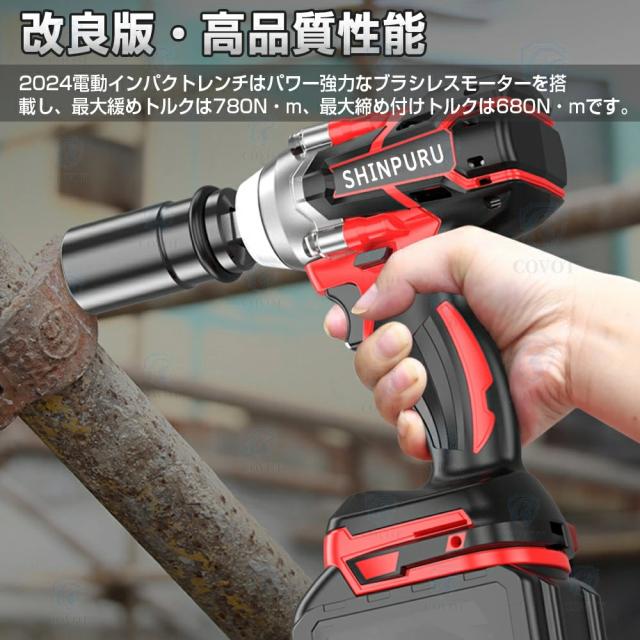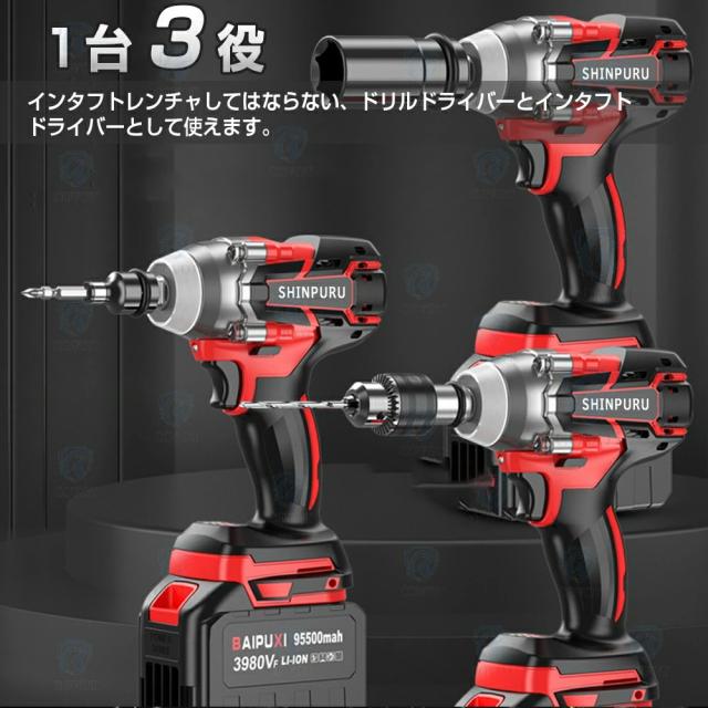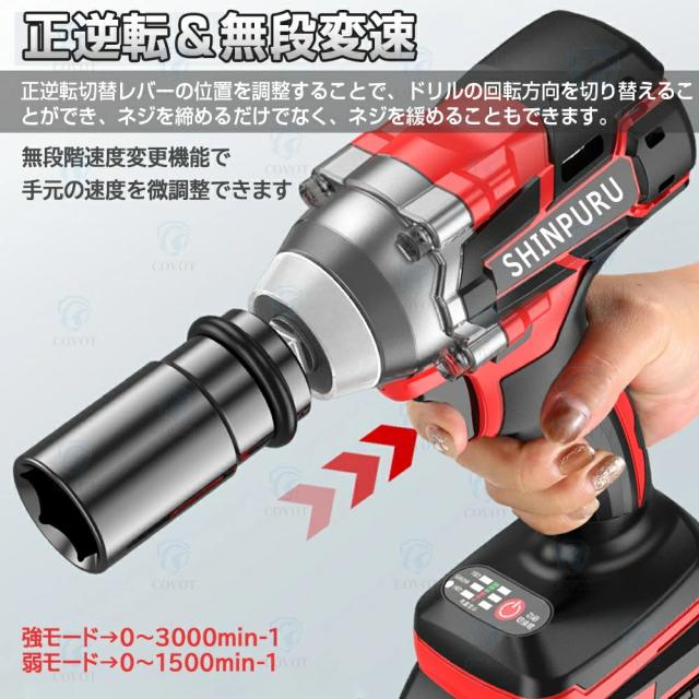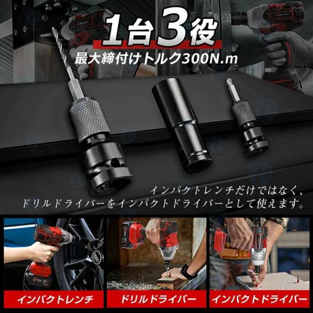 ナットのサイズに対応したソケットを差し込むだけで、すぐ応用でき、工具を使わず、自由に交換できる便利さを持ってます。「レンチ」-ナットとボルトを締めます。本体の差し込み角が12.7mm(1/2インチ)で、ほとんどの市販のソケットを使用でき、使えるに幅広いインパクトレンチです。「コードレスドライバー」チャックは、スクリュービットのねじ込みに適しています。六角ドリルでの掘削に運用可能です。LEDライトを搭載、回転と同時にLEDライトが点灯します。手元をしっかり照らしてくれるので、昼夜を問わず作業が可能です。