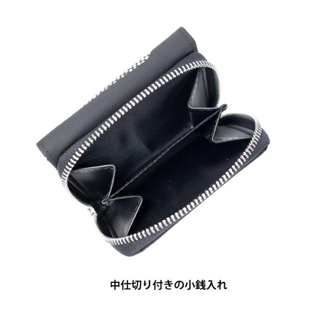 大きくデザインされたロゴプリントと浮き出た小さなロゴがカッコいいミニ財布です。コンパクトながら小銭も札もカードも入るので、修学旅行や通学などお子様にもお勧めです。