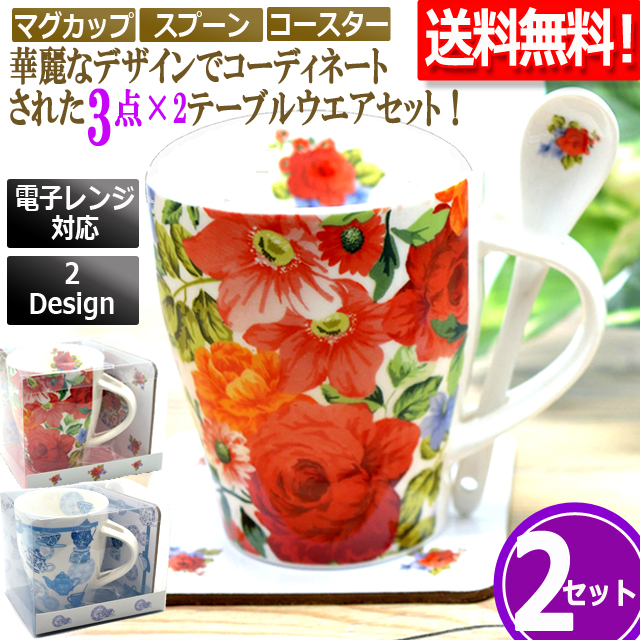 2セット ティータイムコーディネート3点セット 2セット マグカップ スプーン コースター 電子レンジ対応 テーブルウエア おもてなし ギフト 食器