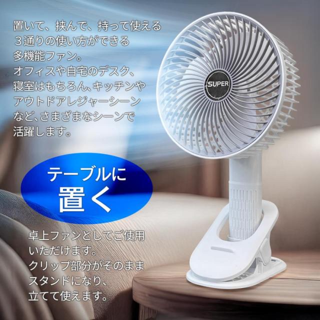 置いて、挟んで、持って使える3通りの使い方ができる多機能ファン!