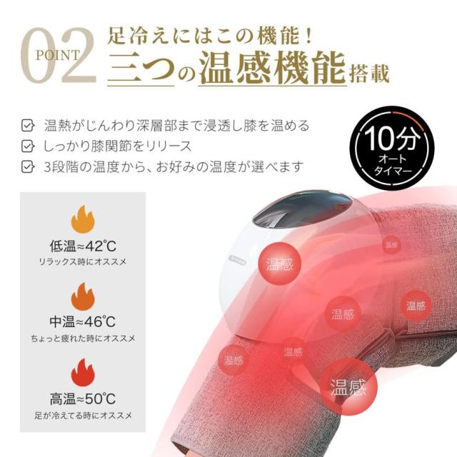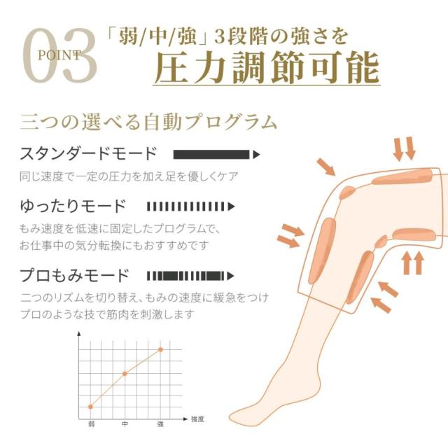 温熱:3つの温度で調整可能で、ヒーターとじきが深くまで温め、春夏の湿気と秋冬の寒さに対応できます。●空気圧:3つのモードが搭載し、 ボタンを押す回数でプロモード、ゆったりモード、スタンダードモードに切り替え可能です。