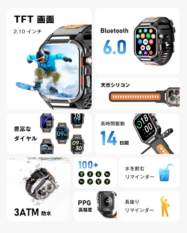 スマートウォッチ 通話機能付き 2.1インチ大画面 タッチスクリーン 腕時計 Bluetooth 6.0 音楽制御 音楽プレイヤー 活動量計 消費カロリー スマートブレスレット スポーツ 歩数計smart watch マルチ運動モード 3ATM防水 心拍数測定【PL保険加入済み製品・安心】