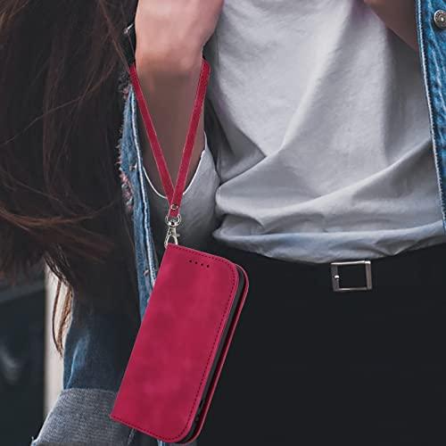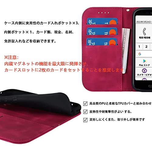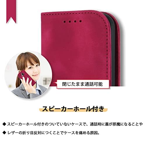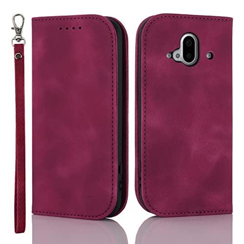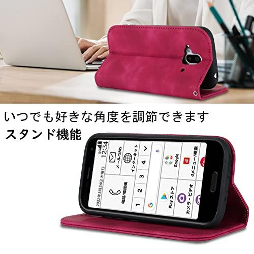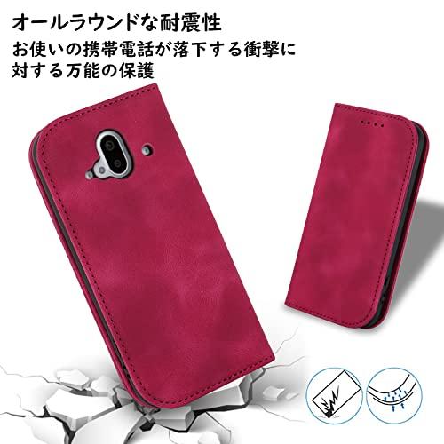らくらくスマートフォン F-52B ケース 手帳型 ストラップ 耐衝撃 マグネット式 カード収納 スタンド機能 スエードの質感-ローズレッド