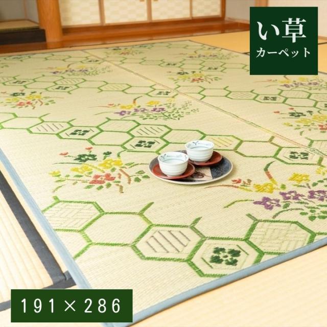 源流 い草 ござ 花ござ 上敷き 和室 敷物 カーペット リビング 花柄 亀甲柄 お手入れ簡単 夏 抗菌防臭 調湿 消臭 空気清浄 汚れにくい 本間3畳 191×286cm グリーン