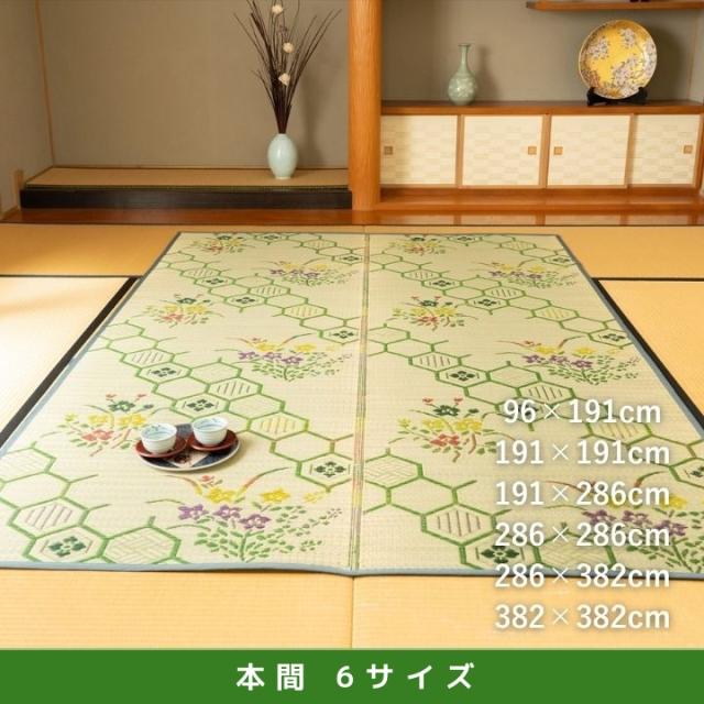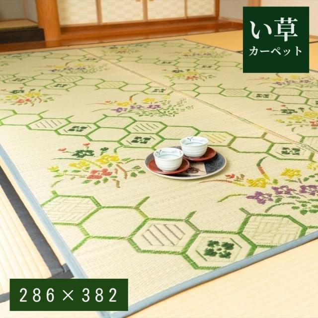 源流 い草 ござ 花ござ 上敷き 和室 敷物 カーペット リビング 花柄 亀甲柄 お手入れ簡単 夏 抗菌防臭 調湿 消臭 空気清浄 汚れにくい 本間6畳 286×382cm グリーン