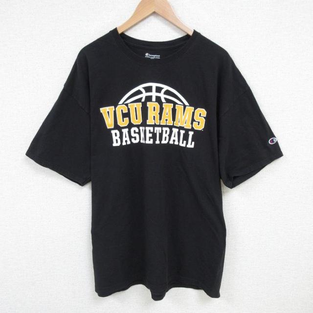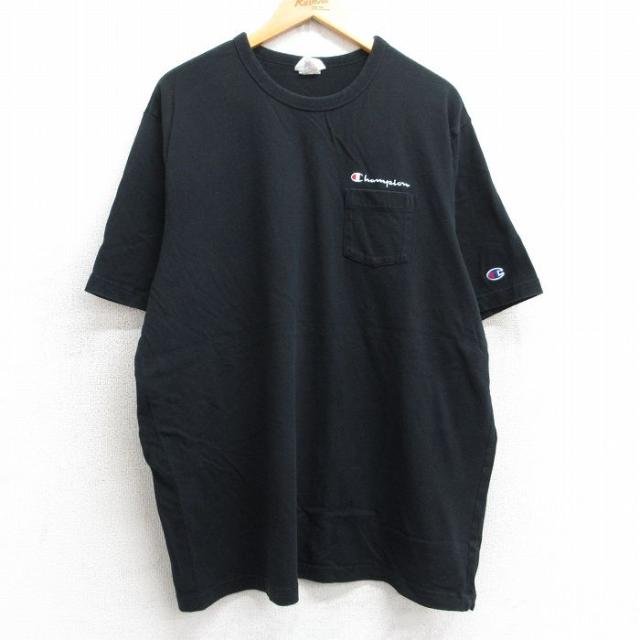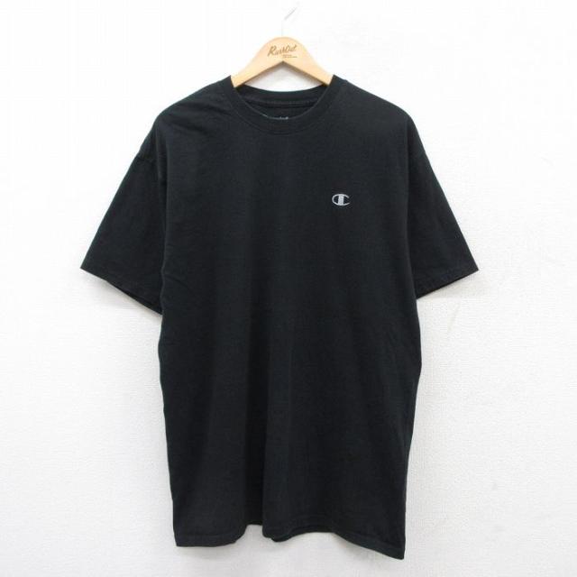 【商品名】 XL★古着 チャンピオン champion 半袖 ブランド Tシャツ メンズ ワンポイントロゴ 大きいサイズ ロング丈 コットン クルーネック 黒 リンガー【spe】