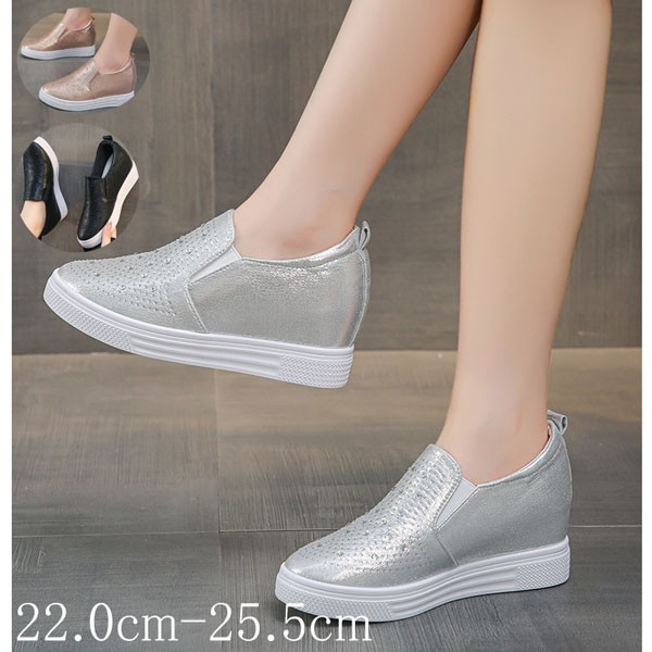 スニーカー インヒール キラキラ スリッポン ゴムソール PU 厚底 小さいサイズ 大きいサイズ ローカット ローファー レディース ブラック シルバー
