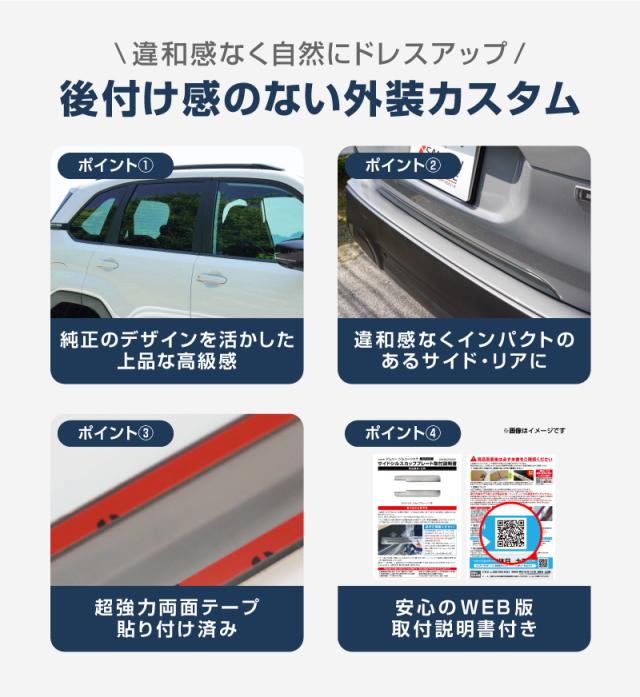 車体形状に沿った専用設計でぴったりフィットし、サイドとリアに洗練されたアクセントを添え、さりげない躍動感と上質な存在感を演出します。