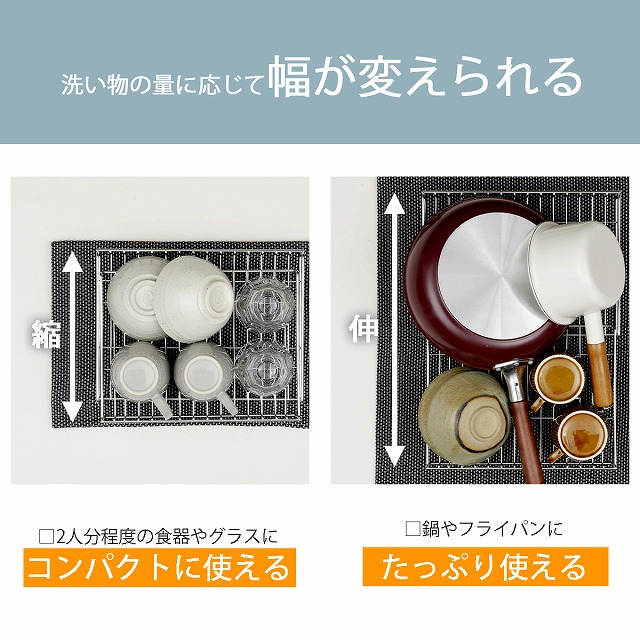 少量の洗い物やお鍋、フライパン、ホットプレートなどの簡易水切りとして。伸縮式で洗い物の量に合わせて幅を変えられます。食洗機に入るコンパクトなサイズ。汚れてきたら丸洗いできます。薄型なので収納する際も場所を取りません。