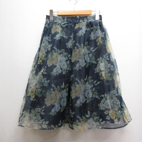 【中古】ダズリン dazzlin 美品 オーガンジー フレア 花柄 スカート S ネイビー バックゴム 裏地付き レディース