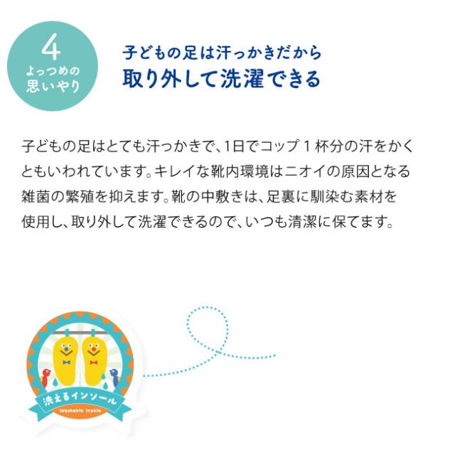 子どもの足の成長をサポートする「4つの機能(つま先ゆったり/カウンターボックス/フレックスジョイント/機能性カップインソール)」により、健やかな成長を促します。